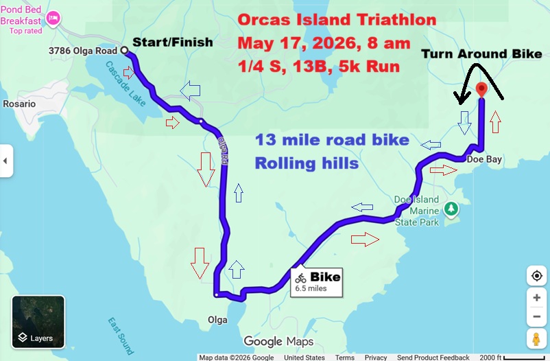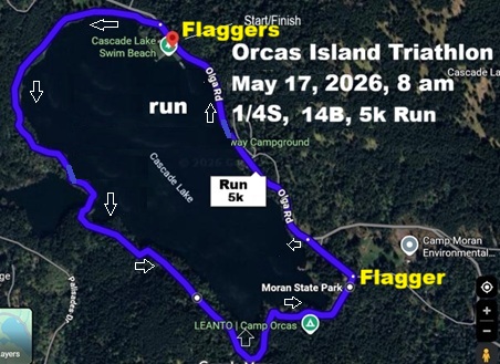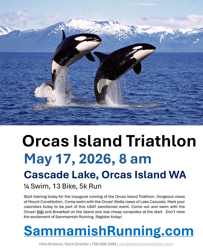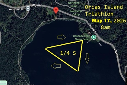 Join us for the Orcas Island Triathlon. 1/4 mile swim in pristine Cascasde Lake, 13 mile rolling hills road bike, 5k challenging trail run around the Lake. Race starts promptly at 8 am in knee water. First one out of the water wins the coveted baby Orca trophy. Must wear ankle bracelet for all three legs, and bib on front torso during he bike and the run for photo finish and timnig. Must go through the two red cones to get scored. You will get six scores, Swim, Bike, Run and 2 transition times as well as overall. All finishers get the Orcas Island triathlon Medal. All entrants get a classic deluxe T-Shirt. There will be certified life guards on Kayaks. Raise your hand if you can if you get into trouble. Water, Gatorade, First Aid, and Gel every 3 miles on the course. Dial 911 in case of emergency and race director for a breakdown or sprained ankle. Good Luck!