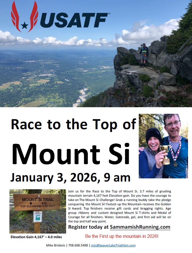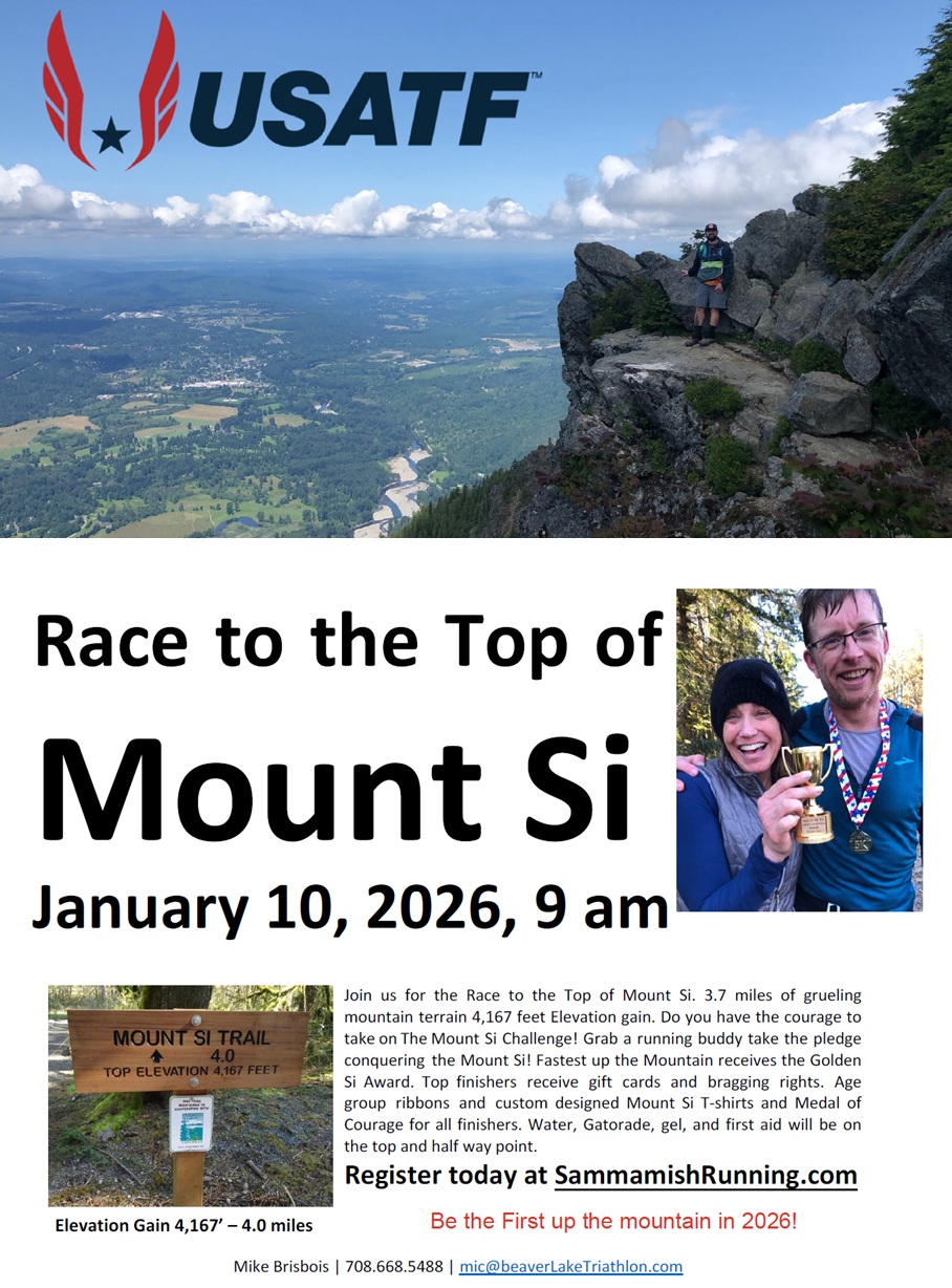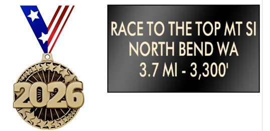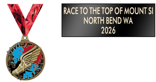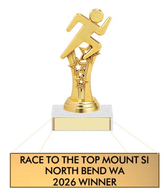 Be the first up to the top of Mount Si in 2026! Join us for the Race to the Top of Mount Si. 3.7 miles of grueling mountain terrain 4,167 feet Elevation gain up to the Rock Garden. Race starts promptly at 9 am. Do you have the courage to take on The Mount Si Challenge! Grab a running buddy take the pledge conquering the Mount Si! Fastest up the Mountain receives the Golden Si Award. Top finishers receive gift cards and bragging rights. Age group ribbons and custom designed Mount Si T-shirts and Medal of Courage for all finishers. Gatorade, water, gel, first aid will be at the top and half point.
