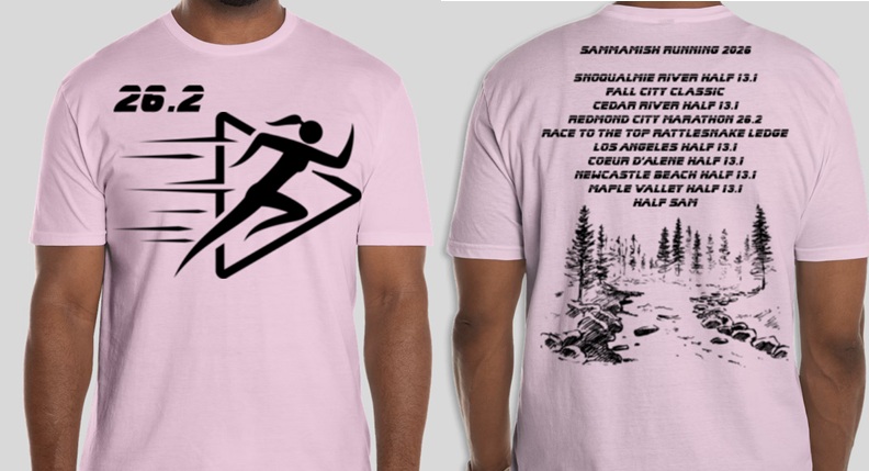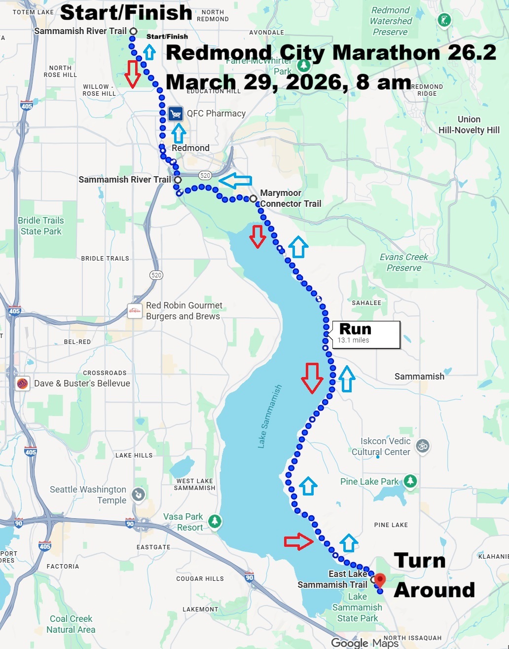 Join us for the inaugural running of the Redmond Marathon 26.2. Starts promptly at 8 am PDT at Sixty Acres park and runs south down Sammamish River Trail the through Marymoor Park onto the Marymoor connector to East Lake Sammamish asphalt Trail. The course is out and back 13.1 miles for a total of 26.2. The course is a Boston Marthon Qualifier - flat and fast. Course record is 3:09:45. First one in that breaks the course record will get a bonus $$. Top 3 male and Top 3 female receive a Starbucks gift card. Cup of Clam Chowder for all finishers. March 28, 2026, Pre-pasta loading 4-6 pm at the Redmond Town Center (Flatstick Redmond WA) - free parking. Included in your registration. Good Luck!