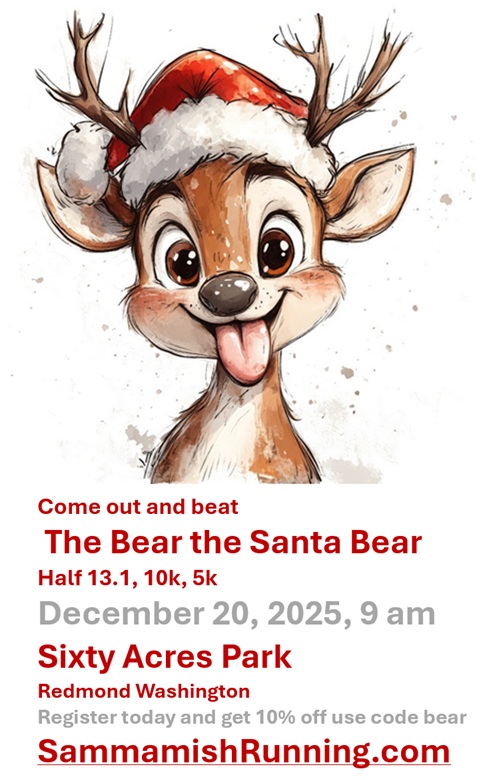 Race starts promptly at 9 am. Come out and Beat the Bear, the Santa Bear. Get your customized medal, Santa Bear T-Shirt and Candy Cane. Festive event with holiday music. Plenty of parking at the Sixty Acres Trail head. Packet pick up starting at 8 am. It is a timed race so please wear your chip/bib on front torso. Happy Holidays!