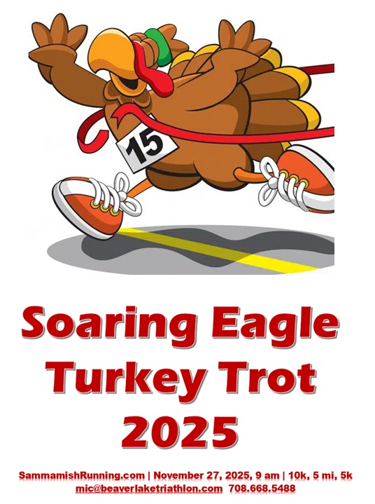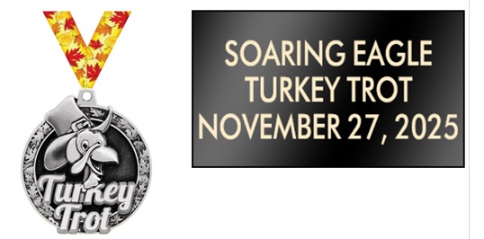 Join us for the Turkey Trot Soaring Eagle Park 5k, 10k (5 mile Trail) and 2k kid's turkey trot. Beat the turkey and win a prize! Parking along Trossachs Boulevard. Race starts promptly at 9 am. Great way to spend your Thanksgiving morning with family and friends. Top male and female in all races wins a pie!